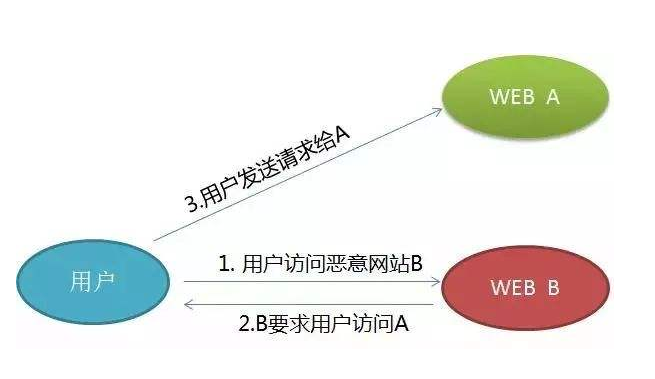 CSRF攻击过程的受害者用户登录网站A,输入个人信息,在本地保存服务器生成的cookie。攻击者构建一条恶意链接,例如对受害者在网站A的信息及状态进行操作,典型的例子就是转账。受害者打开了攻击者构建的网页B,浏览器发出该恶意连接的请求,浏览器发起会话的过程中发送本地保存的cookie到网址A,A网站收到cookie,以为此链接是受害者发出的操作,导致受害者的身份被盗用,完成攻击者恶意的目的。