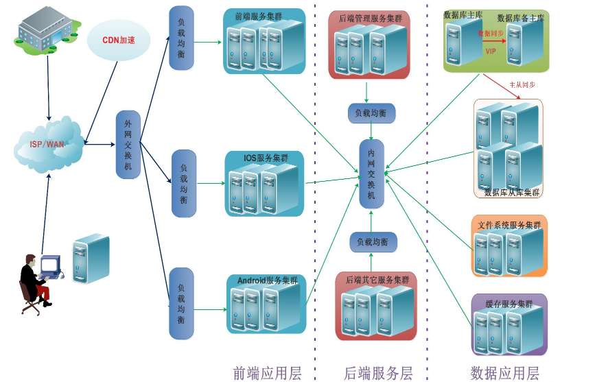 具体使用何种方式,一切以企业实际需求、投入与产出比(成本考虑)为主,但是此类架构也有一定的缺点存在,暂时不考虑前端负载设备的高可用,比如用户的上传与查看文件问题(通过A服务访问上传,然后负载查看时是通B服务器的,就会造成用户无法查看的问题),APP服务器同理;数据库服务器存在主、从库单点问题,一旦故障,可以手工进行故障切换,但是可能会造成数据丢失或不统一,并且会在一定程度上给用户造成不好的体验;因此仍需演变。