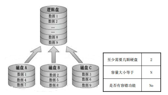 RAID0:RAID0又称为条带模式,是将多个磁盘并列起来,成为一个大磁盘。在存放数据时,其将数据按磁盘的个数来进行分段,然后同时将这些数据写进这些盘中,所以在所有的级别中,RAID0的速度是最快的。但是RAID0没有冗余功能,如果一个磁盘(物理)损坏,则所有的数据都会丢失。因此,RAID0不适用于关键任务环境,但是却非常适合于视频、图像的制作和编辑。