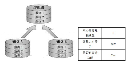 RAID1:RAID1也成为镜像,其将一个磁盘上的数据完全复制到另一个磁盘上。如果一个磁盘的数据发生错误,或者磁盘出现了坏道,那么另一个磁盘可以补救回磁盘故障而造成的数据损失和系统中断。另外,RAID1还可以实现双工—即可以复制整个控制器,这样在磁盘故障或控制器故障发生时,数据都可以得到保护。镜像和双工的缺点是需要多出一倍数量的驱动器来复制数据,但系统的读写性能并不会由此而提高。