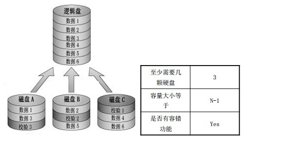 RAID5:RAID5也被叫做带分布式奇偶位的条带,每个条带上都有相当于一个“块”那么大的地方被用来存放奇偶位。与其他RAID级别相比,RAID5把奇偶位信息分布在所有的磁盘上,而并非一个磁盘上,大大减轻了奇偶校验盘的负担,尽管有一些容量上的损失,但RAID5却能提供较为完善的整体性能,因而也是被广泛应用的一种磁盘阵列方案